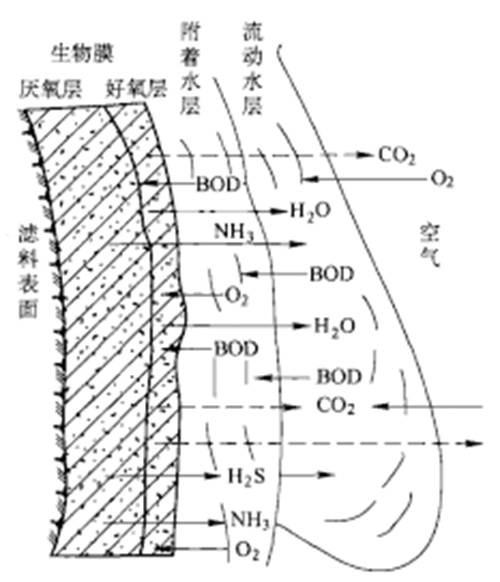 由于生物膜的吸附作用,在膜的表面存在一個很薄的附著水層。污水流過生物膜時,有機物經(jīng)附著水層向膜內(nèi)擴散。膜內(nèi)微生物在氧的參與下,對有機物進行分解和機體新陳代謝。代謝產(chǎn)物沿底物相反的方向擴散,從生物膜傳遞返回液相和空氣中。在整個生物膜系統(tǒng)中,微生物不斷吸收有機營養(yǎng)成分,污水不斷得到凈化,而生物膜也不斷生長,一些老化的生物膜會自動脫落,從而保持了生物膜的良好活性。